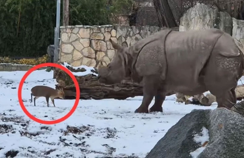 تداول مستخدمو مواقع التواصل الاجتماعي فيديو غريباً من حديقة فروتسواف للحيوان في بولندا، حيث يظهر غزال صغير من نوع المونتجاك الصيني وهو يتحدى وحيد قرن ضخم يزن 1.7 طن، في مشهد غير معتاد جذب ملايين المشاهدين حول العالم. وخلال الفيديو الذي نشرته الحديقة عبر صفحتها الرسمية على فيس بوك، يظهر الغزال الصغير في الفيديو وهو يبدأ الهجوم على وحيد القرن، ويصدم رأسه برأسه مراراً، وسط محاولات من الحيوان الضخم للتغلب عليه، لكن الغزال يواصل مطاردته حتى يفر بعيداً.