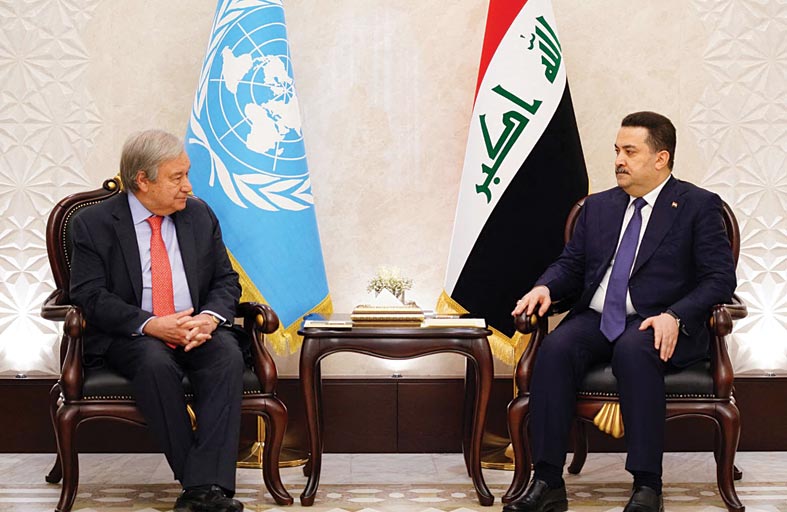 سياسيا، استقبل رئيس مجلس الوزراء العراقي، محمد شياع السوداني، أمس، الأمين العام لمنظمة الأمم المتحدة، أنطونيو غوتيريش، الذي وصل إلى العاصمة بغداد، مساء الثلاثاء ، في زيارة رسمية.