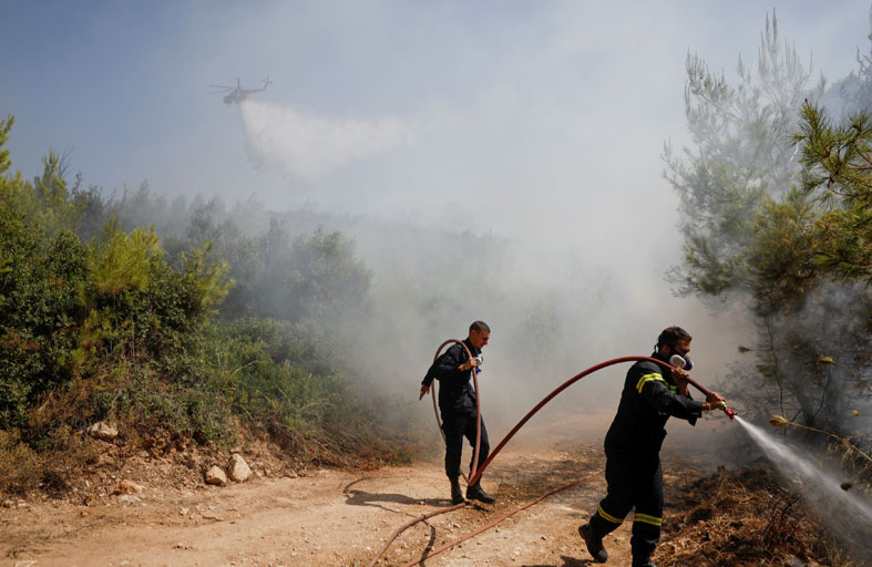 يواصل عناصر فرق الإطفاء في اليونان التصدي لألسنة النيران في أوليمبيا وجزيرة أيفيا، في غرب البلاد وشرقها مع نشوب مئات الحرائق جراء موجة قيظ.