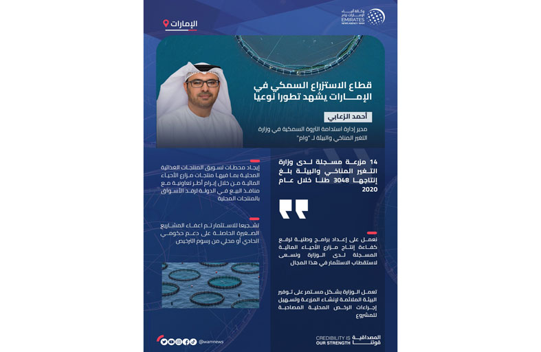 يشهد قطاع الاستزراع السمكي في دولة الإمارات تطورا ملموسا خلال السنوات القليلة الماضية بهدف دعم التوسع والاستدامة في هذا القطاع الحيوي والواعد حيث بلغ عدد المزارع المسجلة لدى وزارة التغير المناخي والبيئة نحو 14 مزرعة بلغ إنتاجها 3048 طنا خلال عام 2020 .
