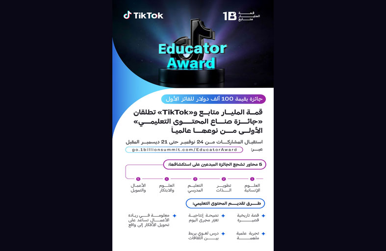 وتمثل كل مشاركة فرصة لإثارة الفضول وتحفيز التعلم على منصة TikTok، ويمكن الاشتراك في "جائزة صناع المحتوى التعليمي" عبر الرابط: go.1billionsummit.com/EducatorAward