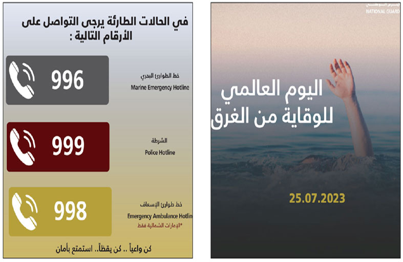 دعت قيادة الحرس الوطني مجموعة حرس السواحل، مرتادي الشواطئ إلى ضرورة الالتزام بالإرشادات والإجراءات الوقائية للحماية من الغرق، وذلك تزامناً مع اليوم العالمي للوقاية من الغرق الذي يوافق 25 يوليو من كل عام. ويُعد اليوم العالمي للوقاية من الغرق فرصة لتسليط الضوء على الأثر العميق للغرق على الأسر والمجتمعات، وتقديم حلول وقائية منقذة للأرواح؛ وبحسب إحصائية أجرتها منظمة الصحة العالمية فإن ما يقارب من 236 ألف شخص يتعرضون للغرق كل عام. ونظمت قيادة الحرس الوطني، حملة توعوية عبر منصاتها على مواقع التواصل الاجتماعي، بينت فيها عددا من الإرشادات والإجراءات الوقائية لضمان التعامل ضد حوادث الغرق منها: ضرورة التأكد من حالة الطقس قبل الذهاب إلى البحر، والسباحة في المناطق المخصصة، وارتداء سترة النجاة عند المشاركة في الأنشطة المائية، وعدم السباحة إلا في وجود منقذ في المنطقة المخصصة، وعدم الدخول إلى البحر عندما يكون العلم الأحمر مرفوعا. وشددت على ضرورة التواصل في حالات الطوارئ، عبر خط الطوارئ البحري 996، أو على الشرطة 999، أو خط طوارئ الإسعاف بالنسبة للإمارات الشمالية على الرقم 998 .
