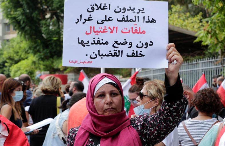 تظاهر مئات اللبنانيين يتقدمهم أهالي ضحايا انفجار مرفأ بيروت  أمس الأربعاء أمام قصر العدل في بيروت بعد يومين من تعليق التحقيق في القضية على خلفية تدخلات سياسية وشكاوى قانونية تطالب بتنحية المحقق العدلي.