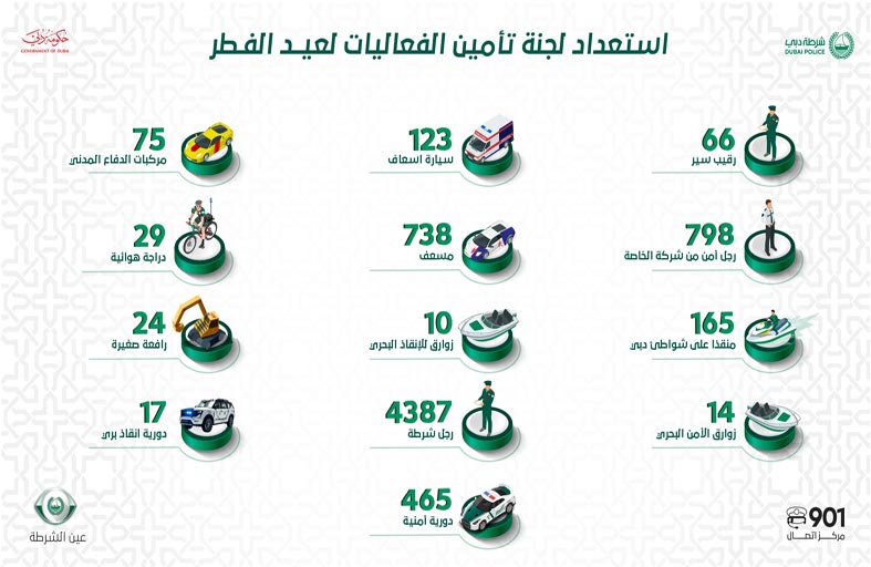 وأوضح الغيثي أن الخطة الأمنية لعيد الفطر تتضمن توفير 66 رقيب سير و798 رجل أمن من الشركات الخاصة، و165 مُنقذا على شواطئ دبي و 14 زورق أمن بحريا و 123 سيارة إسعاف، و738 مسعفا، و10 زوارق للإنقاذ البحري، و4387 رجل شرطة، و 29 دورية دراجة هوائية، و465 دورية أمنية، و 75 مركبة للدفاع المدني، و24 رافعة صغيرة، و17 دورية إنقاذ بري. وأكد اللواء الغيثي جاهزية إدارة مركز القيادة والسيطرة في الإدارة العامة للعمليات لتلقي البلاغات الطارئة على مدار 24 ساعة، والعمل على تأمين وصول الفرق الشرطية المُختصة بأسرع وقت ممكن استجابة وتلبية للنداءات العاجلة والحالات الطارئة..