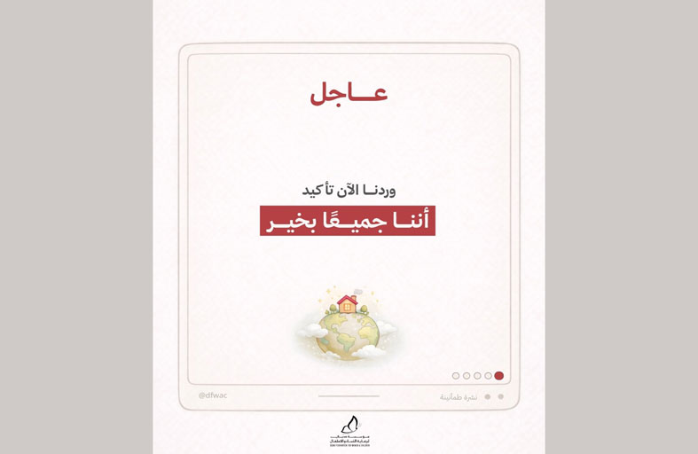 في وقتٍ تتسارع فيه الأخبار وتتزايد فيه الرسائل المتداولة عبر المنصات الرقمية، بثّت مؤسسة دبي لرعاية النساء والأطفال عبر منصاتها الرقمية «نشرة طمأنينة»، وهي نشرة توعوية تهدف إلى نشر رسائل إيجابية تساعد أفراد المجتمع على التعامل بوعي واتزان مع تأثير الأخبار المتدفقة، وتعزز الشعور بالأمان والاستقرار لدى الأفراد والأسر.