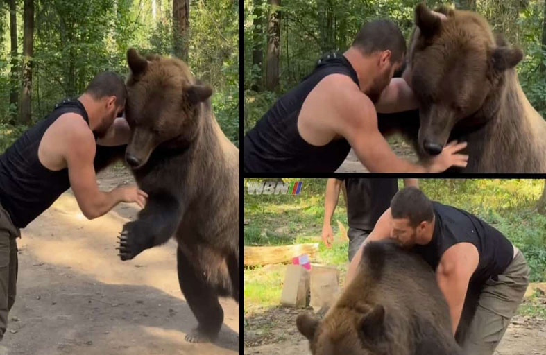 وفي اللقطات، بدا محمودوف وهو يواجه الدب وجهاً لوجه ويتصارع معه، بل وضعه في إحدى اللحظات في قبضة حول العنق خلال التدريب.