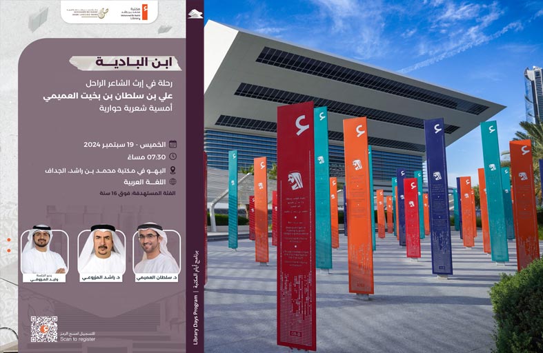 في إطار جهودها للحفاظ على الموروث الثقافي وتوثيقه ونقله للأجيال الجديدة، تنظم مكتبة محمد بن راشد، أمسية شعرية وحوارية استثنائية بعنوان «ابن البادية: رحلة في إرث الشاعر علي بن سلطان بن بخيت العميمي»، الخميس 19 سبتمبر في تمام الساعة السابعة والنصف مساءً؛ وذلك إحياءً لذكرى الشاعر الراحل علي بن بخيت العميمي، أحد أعلام الشعر النبطي في دولة الإمارات، واحتفاءً بما قدّمه من إسهامات بارزة في إثراء الساحة الشعرية.