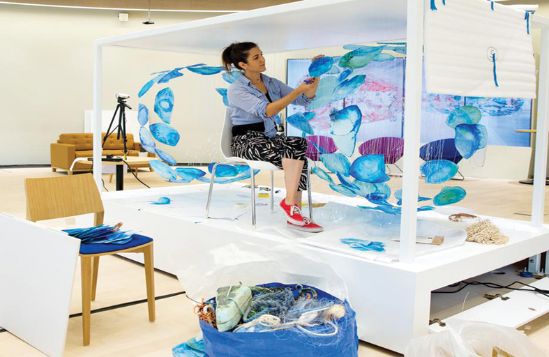 القطعة الفنية المعروضة في الجناح البريطاني، صنعت من مواد جمعتها الفنانة من مخلفات البشر على الشواطئ، مثل شبكات الصيد، وتتميز بأضواء من "فايبر أوبتيك" تمر عبر الساعة الرملية التي تمثل الوقت الذي يعيشه العالم في ظل أزمة التغير المناخي، حسب الفنانة البريطانية.