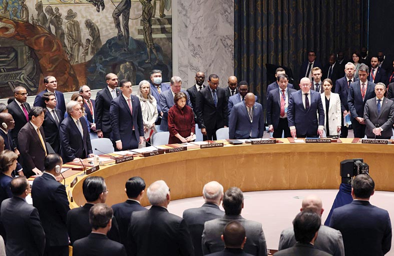 التزم أعضاء مجلس الأمن الدولي دقيقة صمت الجمعة، بمن فيهم ممثل روسيا، تكريما لجميع ضحايا الحرب في أوكرانيا في الذكرى الأولى للغزو الروسي. وكانت الجلسة قد عقدت امس لمناقشة مشروع قرار يطالب روسيا بالانسحاب من أوكرانيا.