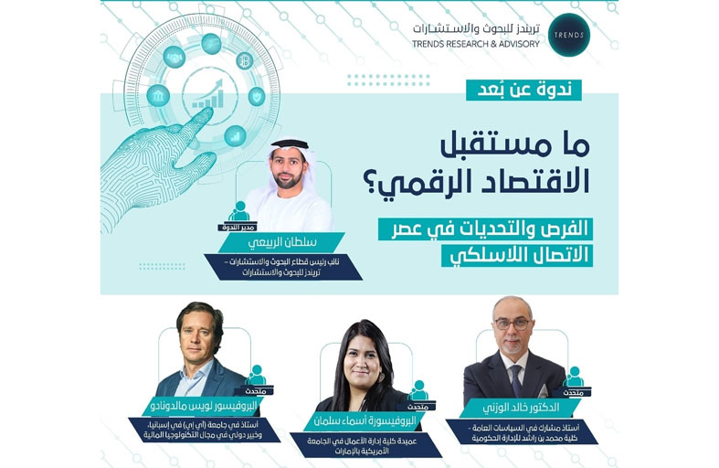 جاء ذلك في ندوة عن بُعد حملت عنوان: «ما مستقبل الاقتصاد الرقمي؟ الفرص والتحديات في عصر الاتصال اللاسلكي»، ونظمها مركز تريندز للبحوث والاستشارات - قطاع «تريندز - دبي»، في إطار سلسلة الندوات العلمية والمعرفية الدورية الهادفة إلى تحليل القضايا والأزمات العالمية واستشراف مستقبلها.