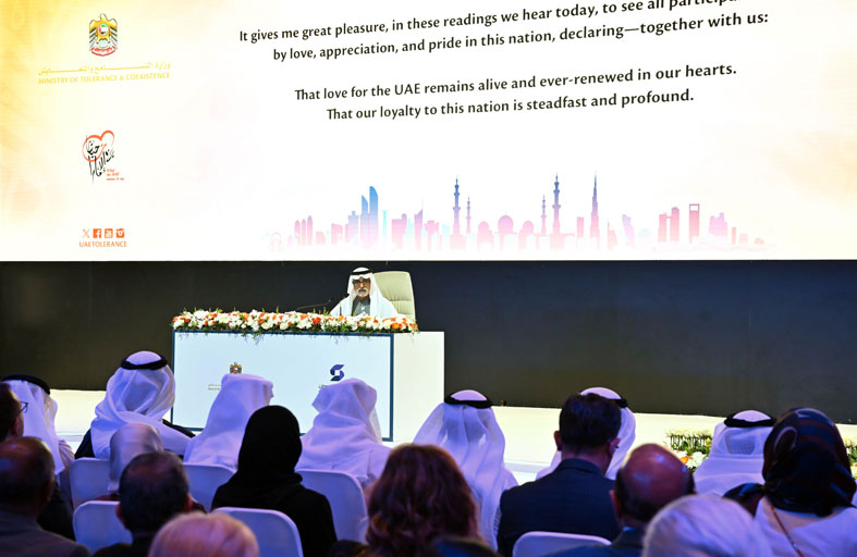 وقال معاليه إن الكتابات التي قدمها الملتقى أظهرت بما لا يدع مجالا للشك هذا التلاحم القوي بين كافة فئات المجتمع الإماراتي من المواطنين والمقيمين، على حب الوطن والاعتزاز بالانتماء إليه، فكانت رمزا لأن الكل في واحد، يداً بيد، تجمعهم مشاعر الاعتزاز بالدولة وبما توفره من حياة كريمة ونظام راسخ ومتين، موضحا أن دولة الإمارات تواصل دورها الفاعل في ترسيخ مبادئ السلام والتعايش، انطلاقاً من مواقف ثابتة وقيم أصيلة، تسهم من خلالها في تعزيز الاستقرار العالمي، مشدداً على أن الدولة لها مواقفها الراسخة في مواجهة كل عدوان، وأنها تسعى للتعايش والسلام قولا وفعلا، وتأخذ بالحكمة وبُعد النظر في مواجهة كافة التحديات.