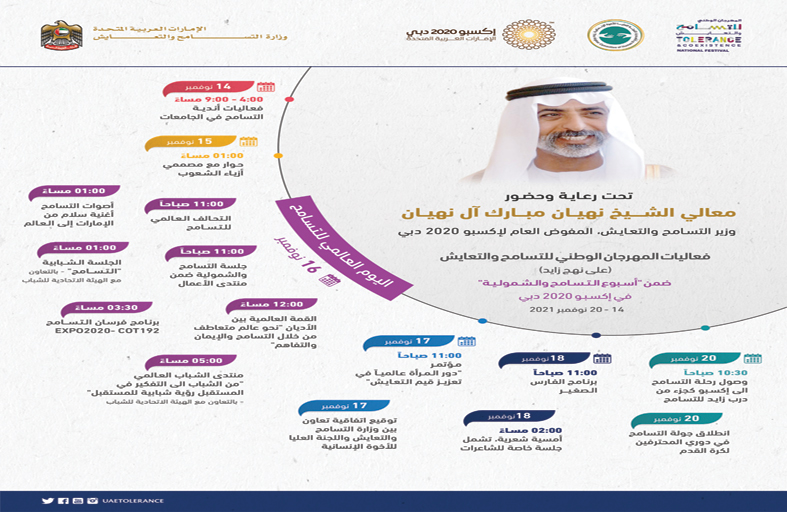 تنطلق صباح اليوم الأحد 14 نوفمبر فعاليات المهرجان الوطني للتسامح والتعايش في نسخة عالمية تستمر على مدى أسبوع كامل، ويتكامل المهرجان الذي تنظمه وزارة التسامح والتعايش مع "أسبوع التسامح والشمولية" حيث يحتضن إكسبو 2020 دبي الجانب الأكبر الأنشطة والمبادرات، ويشارك بها كافة الأجنحة الموجودة بالمعرض، والتي تربو على 192 دولة، وتستضيف الأنشطة الدولية للمهرجان ما يزيد على 125 شخصية عالمية بارزة ليقدموا جميعا رؤية شاملة ومتنوعة عن مستقبل التسامح العالمي، كما يشارك في برامج المهرجان حوالي 4000 من طلاب المدارس والجامعات، من خلال 140 فعالية محلية وعالمية، وطلابية، ويركز المهرجان هذا العام على قضايا الشباب والأديان والمرأة والجامعات. وتضم أنشطة المهرجان الدولية هذا العام ، إطلاق التحالف العالمي للتسامح في 16 نوفمبر وعلى وجه التحديد الساعة 11:16 صباحًا، حيث يجتمع العالم بأسره لإطلاق هذا التحالف احتفالًا باليوم العالمي للتسامح في تعهد مشترك وموحد للتسامح و التعايش السلمي، ثم تنطلق القمة العالمية المشتركة للأديان، وهي قمة للحوار بين الأديان تستعرض احتضان الإمارات العربية المتحدة لمختلف الأديان والمعتقدات في العالم، وتهدف القمة العالمية الى تشجيع الحوار من أجل فهم أفضل للاختلافات التي تجعلنا جميعًا مميزين ومتميزين في معتقداتنا، ولكن متحدون في إنسانيتنا المشتركة، وتهدف إلى تعزيز المشاركة مع العالم وتنمية التعايش والشمولية من أجل المساهمة في التعايش السلمي والمستدام في كل مكان ويحضرها قادة دينيون وسياسيون وأمميون حول العالم.