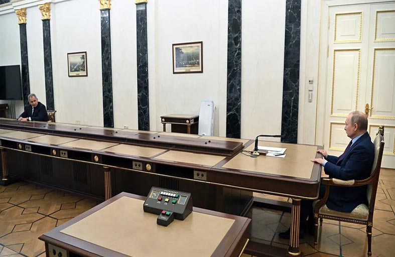 جالسًا في نهاية طاولة طويلة يوم أمس الأول الاثنين 14 فبراير استمع إلى وزير خارجيته، سيرجي لافروف، وهو يخبره أنه لا تزال هناك “فرصة” للتوصل إلى حل وسط مع الغرب لحل الأزمة الأوكرانية، ثم وزير دفاعه الوزير سيرجي شويغو الذي قال إن التدريبات العسكرية في بيلاروسيا “تقترب من نهايتها”. أجابهما الرئيس باقتضاب بـ “جيد”. مسرحة واخراج، تجعل من الممكن، بين ضجيج الأحذية والمفاوضات، الحفاظ على دبلوماسية عدم اليقين.