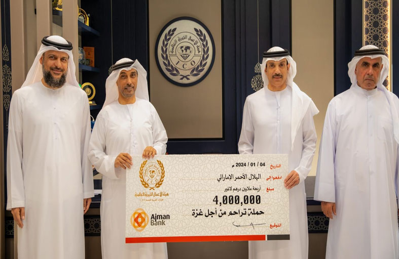 سلم سعادة الشيخ محمد بن عبدالله النعيمي رئيس مجلس أمناء هيئة الأعمال الخيرية العالمية، شيكاً بمبلغ 4 ملايين درهم ، تسلمه عمر الشمري مدير مركز الهلال الأحمر في إمارة عجمان، وذلك دعماً لحملة “تراحم من أجل غزة” التي تم إطلاقها بهدف مساعدة الأشقاء في فلسطين.
