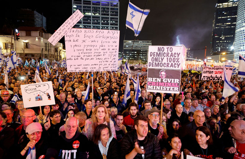 وتتواصل التظاهرات كلّ أسبوع منذ أن طرحت حكومة نتانياهو، الأكثر يمينيّة في تاريخ إسرائيل، في كانون الثاني/يناير مشروع إصلاح النظام القضائي الذي يثير انقسامًا في البلاد. ويدعو منظّمو الحركة الاحتجاجيّة إلى “شلّ” البلاد.