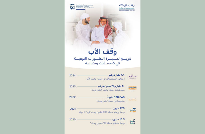 قصة نجاح عالمية مبهرة وملهمة لما يعتبر اليوم أكبر حراك إنساني وطني على مستوى العالم، يشارك فيه مجتمع الإمارات بأكمله كبيره وصغيره، أفراده ومؤسساته، جهاته الحكومية وشركاته الخاصة وجمعياته الأهلية والخيرية، في مشهد يقدم أروع نموذج للعطاء في سبيل المساهمة في دعم شعوب الأرض للتغلب على تحدياتها الأكثر إلحاحاً بدءاً من الجوع، وبما لا يقف عند تحديات التعليم والصحة.هذا الحراك الاستثنائي رسخته سلسلة النجاحات التي حققتها الحملات الرمضانية التي اعتاد على إطلاقها صاحب السمو الشيخ محمد بن راشد آل مكتوم نائب رئيس الدولة رئيس مجلس الوزراء حاكم دبي “رعاه الله”، خلال الشهر الفضيل، متوجاً سموه هذه النجاحات خلال العام الحالي بإطلاق حملة "وقف الأب"، بهدف تكريم الآباء في دولة الإمارات من خلال إنشاء صندوق وقفي مستدام بقيمة مليار درهم، يخصص ريعه لتوفير العلاج والرعاية الصحية للفقراء والمحتاجين وغير القادرين. القصة بدأت عام 2020، بحملة "10 ملايين وجبة"، لتشهد تطورات نوعية غير مسبوقة في ظل ما حظيت به من تفاعل كبير وتجاوب شامل من مجتمع الإمارات، فجاءت هذه التطورات بالتوسع حجماً عبر حملة "100 مليون وجبة" في عام 2021، ثم حملة "مليار وجبة" في عام 2022، بعدها شهدت سلسلة الحملات نقلة نوعية، بالتحول نحو الوقف من خلال حملة "وقف المليار وجبة" في العام 2023، مستهدفة تأمين شبكة مستدامة لمواجهة تحديات الجوع في الدول والمناطق الأقل حظاً.