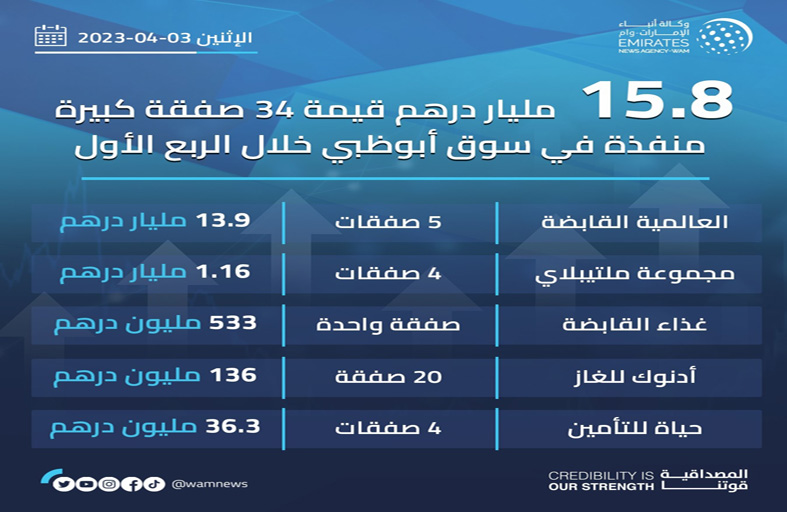 15.8 مليار درهم قيمة 34 صفقة كبيرة منفذة في سوق أبوظبي خلال الربع الأول من 2023