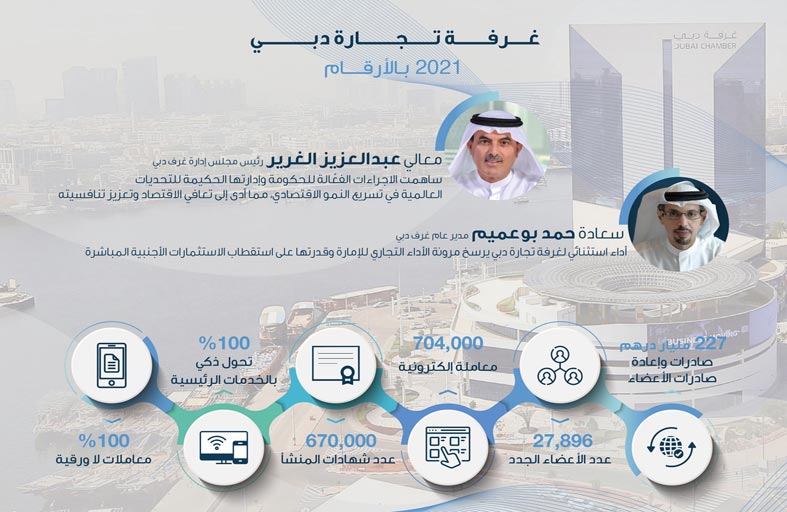 وأكد بوعميم :” وبينما تمضي إمارة دبي في خططها التنموية لن تدخر غرفة تجارة دبي أي جهد في دعم الشركات على اختلاف أنواعها وقطاعاتها وستركز جهودها من أجل الارتقاء بمكانة دبي على الساحة العالمية ودعم وحماية مصالح مجتمع الأعمال في الإمارة.” وقامت الغرفة بإنجاز 704,408 معاملة إلكترونية خلال العام 2021 وبنسبة نمو بلغت 7% مقارنة بعددها في العام 2020 في حين نجحت الغرفة بالتحول الرقمي الكامل لخدماتها بنسبة 100% خلال العام 2021 لتحتل موقع الريادة في مواكبة المتغيرات العالمية وتعزز من خدماتها السريعة لقطاع الأعمال. كما حقّقت الغرفة هدفها باعتماد المعاملات اللاورقية بنسبة 100? بحلول نهاية عام 2021 مما يمثل نقلة مهمة في مسيرتها نحو التحوّل الرقمي.