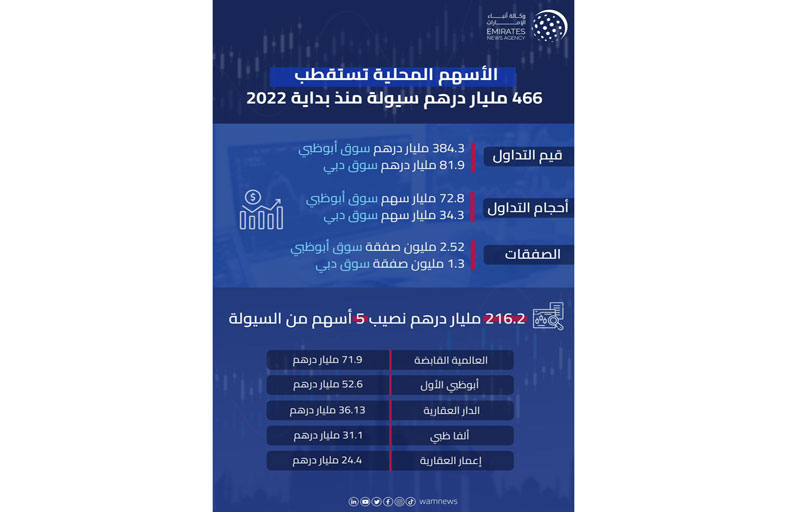 466.3 مليار درهم سيولة الأسهم المحلية في 2022 .. و5 أسهم تستحوذ على 46 % منها