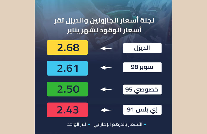 أقرت لجنة متابعة أسعار الجازولين والديزل، أسعار الوقود لشهر يناير 2025،على النحو التالي:- وقود الديزل: 2.68 درهم لكل لتر.- البنزين السوبر "98": 2.61 درهم لكل لتر.- البنزين خصوصي "95": 2.50 لكل لتر.- البنزين "إي بلس" 91 : 2.43 درهم لكل لتر.