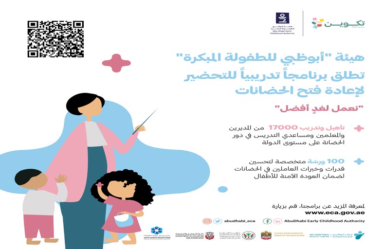 ترجمة لحرصها على تعزيز تنمية قطاع الطفولة المبكرة، ولضمان سلامة ورفاهية الأطفال في دور الحضانة، أعلنت هيئة أبوظبي للطفولة المبكرة ضمن برنامج تكوين الصيفي 2020، وبالتنسيق مع وزارة التربية والتعليم ودائرة التعليم والمعرفة- أبوظبي ومجلس الشارقة للتعليم، وهيئة الشارقة للتعليم الخاص، ومركز أبوظبي للصحة العامة، عن إطلاقها لبرنامجِ تدريب تخصصي يستهدف العاملين في دور الحضانة بعنوان «نعمل لغدٍ أفضل»، لرفع جاهزية الحضانات لاستقبال الأطفال في ظل الظروف الراهنة، ودعم عملية تشغيلها بالطرق الآمنة، وجعلها بيئة آمنة ومثمرة تساهم في تنمية الطفل وضمان رفاهيته.