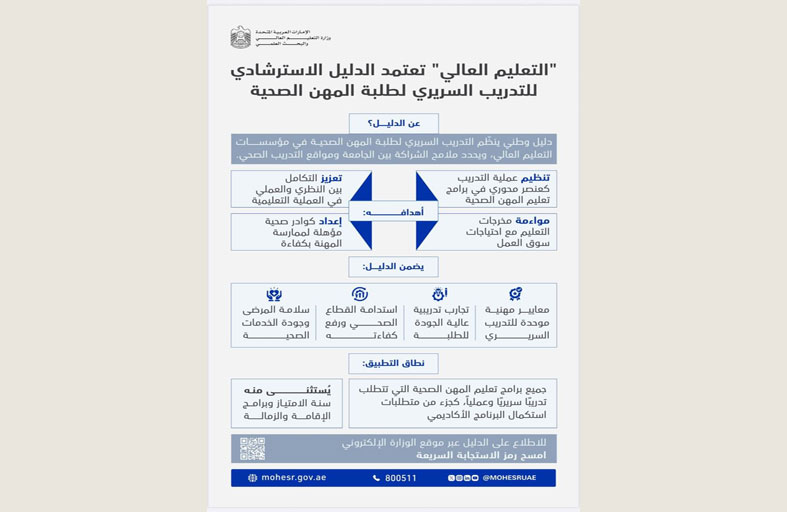 وأضاف أن هذه الخطوة تشكل جزءاً من مساعي وزارة التعليم العالي والبحث العلمي لترسيخ معايير مهنية موحدة للتدريب السريري، تسهم في دعم استدامة القطاع الصحي ورفع كفاءته، وتواكب تطلعات دولة الإمارات في بناء منظومة تعليمية وصحية متكاملة، تلبي احتياجات التنمية المستقبلية.