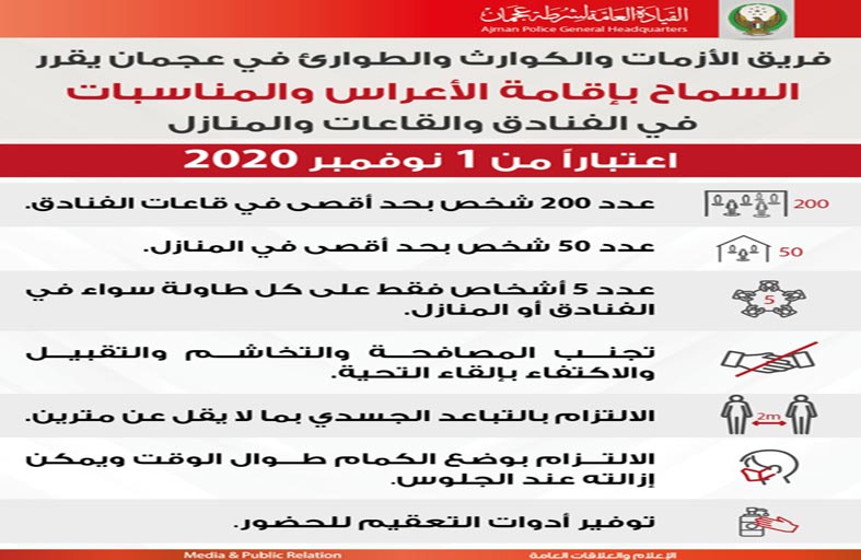 قرر فريق إدارة الطوارئ والأزمات والكوارث في إمارة عجمان السماح باستئناف إقامة حفلات الأعراس والمناسبات في القاعات و الفنادق و المنازل في الإمارة اعتباراً من أمس الأول من نوفمبر الحالي مع التأكيد على الالتزام بالاحترازات والتدابير الوقائية المعتمدة والتي تضمن سلامة المشاركين والمدعوين. وقال سعادة اللواء الشيخ سلطان بن عبد الله النعيمي قائد عام شرطة عجمان رئيس فريق إدارة الطوارئ والأزمات والكوارث المحلي إن قرار استئناف إقامة الحفلات يتضمن ألا يزيد عدد المدعوين في صالات الأفراح عن 200 شخص، ولا يزيد عن 50 شخصاً في المنازل، و تحديد خمسة أشخاص فقط على الطاولة الواحدة في كلا الحالتين، مع الالتزام بالإجراءات الاحترازية والوقائية المعتمدة في الدولة وارتداء الكمامات و الحفاظ على التباعد الجسدي والمسافات بين الطاولات.
