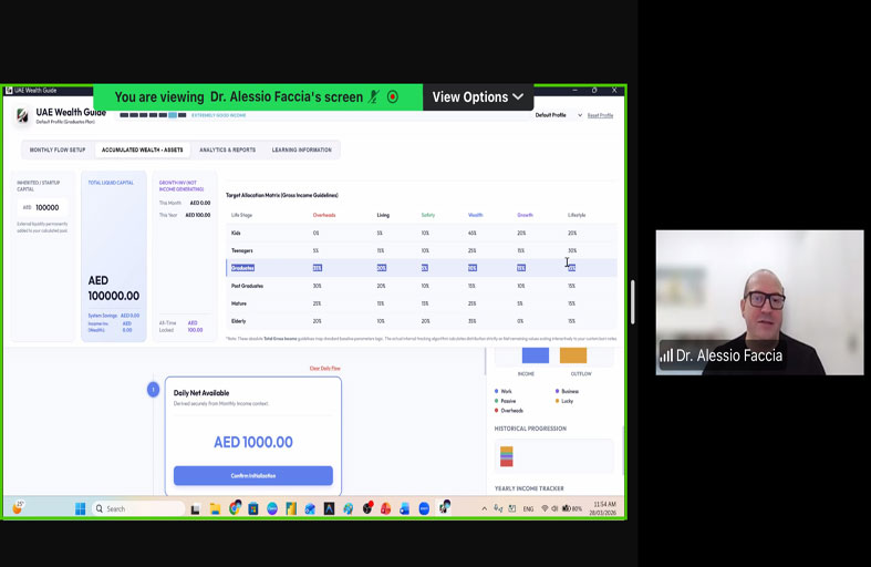 نظّمت مكتبة محمد بن راشد جلسة معرفية افتراضية بعنوان «المال لا يجب أن يكون معقداً» عبر تطبيق «زووم»، قدّمها الدكتور أليسيو فاشيا (Alessio Faccia)، وذلك ضمن برنامج المعرفة والعلوم المتخصصة، وبحضور عدد من المهتمين بالثقافة المالية وإدارة الأموال.