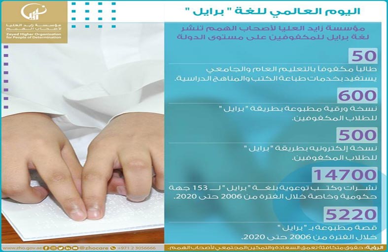 وأضافت أن مؤسسة زايد العليا لأصحاب الهمم ممثلة في إدارة رعاية المكفوفين التابعة لها والتي تمتلك المطبعة الوحيدة بالدولة تحول النصوص المكتوبة للطباعة بطريقة برايل تضطلع بمهمة رئيسية في العمل على نشر لغة برايل بين ذوي التحديات البصرية على مستوى الدولة، ومساعدتهم على الاندماج الكامل في المجتمع، مشيرة إلى أن الإدارة أطلقت العديد من المبادرات والمشاريع في هذا الإطار تهدف جميعها لنشر لغة برايل للمكفوفين، ولإثراء ثقافة الكفيف والنهوض بواقعه منها جائزة القصة المقروءة بطريقة برايل وهي عبارة عن مشروع يعتبر الأول من نوعه على مستوى الوطن العربي "القصة المقروءة بطريقة برايل" إحدى مبادرات الإدارة ويحمل شعار "الجميع يقرأ".