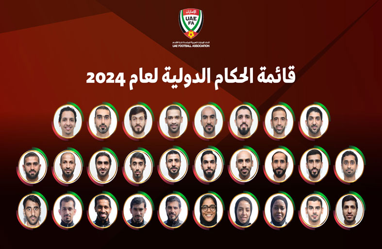 اعتمد الاتحاد الدولي لكرة القدم القائمة الدولية لحكام وحكمات كرة القدم والشاطئية والصالات في الإمارات لعام 2024، والتي ضمت 24 حكماً بالإضافة إلى 7 حكام لتقنية الفيديو المساعد. وضمت القائمة الدولية 8 حكام للساحة بالنسبة لكرة القدم وهم محمد عبد الله حسن، عمر محمد آل علي، عادل علي النقبي، أحمد عيسى درويش، يحيي علي الملا، سلطان محمد صالح، خلود خدوم الزعابي، محمد عبد الله الهرمودي و 10 حكام مساعدين هم: محمد أحمد يوسف، وحسن محمد المهري، وجاسم عبد الله آل علي، وأحمد سعيد الراشدي، وعلي راشد النعيمي، وسبت عبيد سرور، وأمل جمال ناصر، وسعيد راشد المرزوقي، وياسر سبيل المرشدي، ومحمد حسين المازمي و 7 حكام “شارات” لتقنية الفيديو، وهم: محمد عبد الله حسن، عادل علي النقبي، عمر محمد آل علي، محمد عبيد خادم، صقر حمدان الزعابي، عيسى خليفة الهاجري، أحمد سعيد النقبي.كما تضمنت القائمة الحكام : فهد بدر الحوسني، أحمد عبد الله الغيص، نجاة حسن البلوشي، ياسر خلفان الزعابي “ كرة الصالات”، وإبراهيم يوسف الرئيسي، ونواف أحمد حسن “ الكرة الشاطئية».