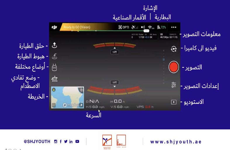 وفي ورشة "فنون التصوير بالطائرات  دون طيار"، التي قدمها خالد البستكي، طالب هندسة معمارية ومصور فوتوغرافي، تعرف المشاركون إلى أنواع الطائرات دون طيار "الدرونز"، وكيفية الاستفادة منها في عمليات الإنقاذ والمسح الجيولوجي والتصوير الجوي، وتعلموا أساسيات التصوير الجوي بالدرونز وكيفية التقاط صور ومقاطع مرئية بواسطتها وبرمجتها لتخطي العوائق، والتحكم في طيرانها وهبوطها عن بُعد ضمن نطاق الأمن والسلامة، وكيفية استخراج التصاريح الخاصة بها من الجهات المعنية، وأهمية الاطلاع على النظم والقوانين المعمول بها في الدولة بشأن التصوير "بالدرونز".