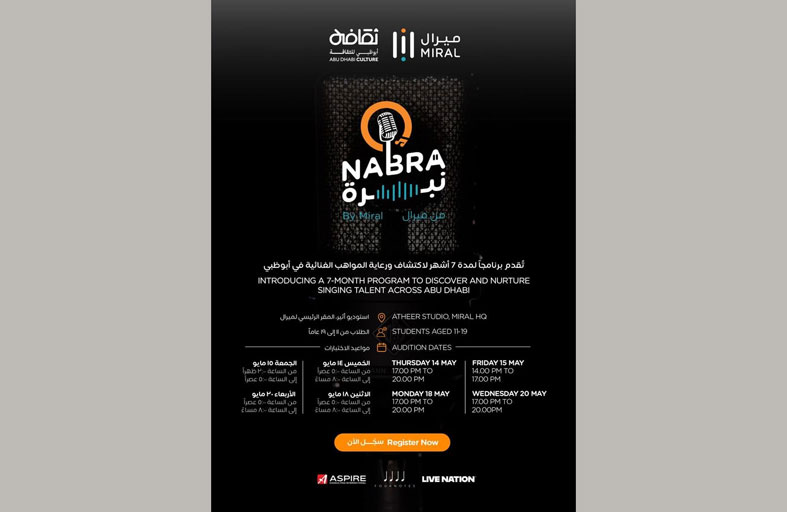 أعلنت ميرال، المتخصصة في تطوير الوجهات والتجارب الغامرة في أبوظبي عن إطلاق النسخة الأولى من برنامجها "نبرة من ميرال" لاكتشاف وتطوير المواهب الناشئة، وذلك بالتعاون مع برنامج "موهبتي" التابع لدائرة الثقافة والسياحة – أبوظبي.