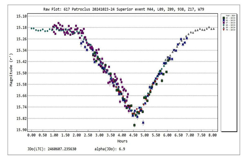 وأضاف أن الكويكب المطلوب رصده عبارة عن كويكب ثنائي، بمعنى أنه يتكون من كويكبين يدوران حول بعضهما البعض مرة واحدة كل 103 ساعات، ويسمى الكويكب الكبير “617 Patroclus” ويبلغ قطره 113 كم، ويسمى الكويكب الأصغر “Menoetius” ويبلغ قطره 104 كم ، وهذا الكويكب هو واحد من خمسة كويكبات تقع بالقرب من المشتري ستزوره مركبة "ناسا" الفضائية عام 2033م.