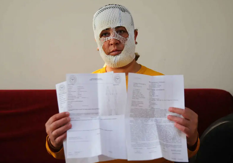 وشخَّص الأطباء في المستشفى حالة سيدة بأنها حروق وجه من الدرجة الثانية، وتحتاج لعلاج طبي بدؤوا به بالفعل ولفوا وجهها بالشاش الطبي الأبيض بشكل شبه كامل.
