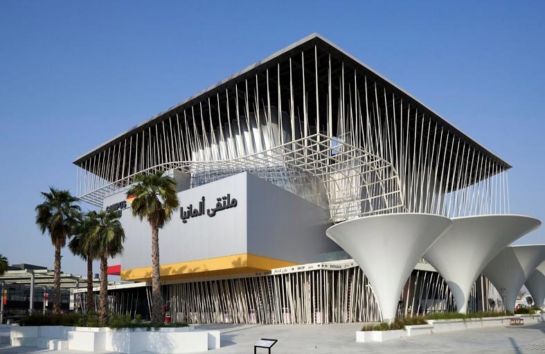 فالجناح الالماني بمعرض اكسبو مقسم إلى ثلاثة أقسام يمثل كل منها واحد من المواضيع الفرعية ‏الثلاثة، وهي: الفرص والتنقل ‏والاستدامة ويقع الجناح الألماني في القسم الخاص بموضوع الاستدامة ‏، ففي ألمانيا، كانت جذور «عملية تحول الطاقة»، وهنا يلتزم ‏قطاع البحث العلمي والاقتصاد وقطاعات ‏كبيرة من المجتمع المدني بالعمل في سبيل تحقيق مستقبل مستدام. يسعى «ملتقى ألمانيا» ‏إلى توصيل ‏هذه الرسالة إلى دبي ، حيث يتناول الجناح الألماني في دبي من خلال فكرة الحرم الجامعي ‏‏(‏CAMPUS‏) موضوعاً يتلقى ‏الكثير من الاهتمام والدعم في المنطقة، وهو موضوع التعليم. إن رسالة ‏الجناح ليست معقدة، بل هي واضحة ومفهومة. يمكن للجميع ‏المشاركة والشعور في الوقت ذاته ‏بأنفسهم كجزء من مجتمع كبير. هذا هو تواصل العقول وصنع المستقبل ، ويحاكي التصميم ‏المعماري ‏للجناح الألماني والذي وضعه مكتب لافا للعمارة‎ (LAVA – Laboratory for Visionary ‎Architecture) ‎كذلك الفكرة ‏الرئيسة، وهي فكرة الحرم الجامعي التي يشير إليها العنوان الإنجليزي ‏للجناح. فلن يكون الجناح مبني كلاسيكياً، بل يتكون من ‏مجموعة عمودية من الوحدات البنائية والتي ‏يأطرها هيكل مشترك - مثلما تأطر الحدائق الحرم الجامعي، فقط في الاتجاه الرأسي‎.‎