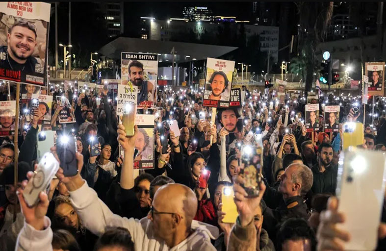 تجمّع مئات الإسرائيليّين في ما بات يُعرف باسم ساحة الرهائن، في تلّ أبيب للمطالبة بإطلاق نحو 140 شخصا لا يزالون محتجزين لدى حركة حماس في قطاع غزّة. ومع توالي صعود المتحدّثين إلى منصّة أقيمت في الساحة، رفع مشاركون لافتات كُتب عليها «إنّهم يثقون بنا لإخراجهم من الجحيم» و»أعيدوهم الآن إلى الوطن». وقال روبي تشين، والد الرهينة إيتاي تشين البالغ 19 عاما، بعد اعتلائه المنصّة «نطالب الحكومة الإسرائيليّة وحكومة الحرب بشرح ما هو مطروح بالضبط على طاولة المفاوضات».