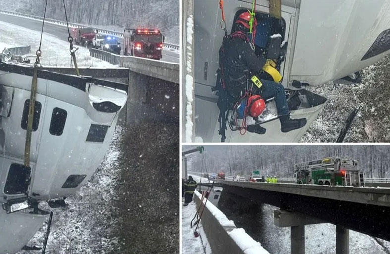 نجا سائق شاحنة أمريكي من كارثة محققة، بعد أن انزلقت شاحنته على طريق سريع مغطّى بالثلوج في ولاية فرجينيا الغربية، لتتدلّى مقصورة القيادة خارج جسر بارتفاع يقارب 30 متراً فوق سطح الأرض، في مشهد مرعب وثّقته مقاطع فيديو على مواقع التواصل الاجتماعي.