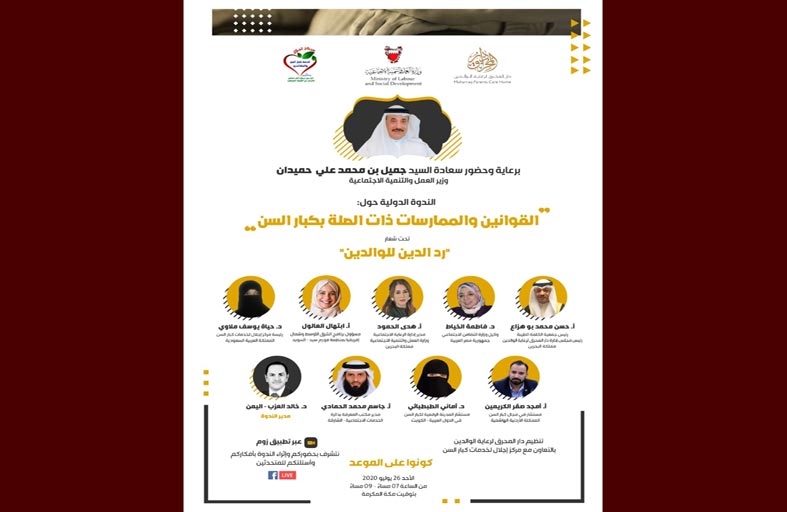 شاركت دائرة الخدمات الاجتماعية بالشارقة، في الندوة الدولية التي تناولت "القوانين و الممارسات ذات الصلة بكبار السن" والتي جاء تحت شعار "رد الدين للوالدين" نظمتها دار المحرق لرعاية الوالدين، ومركز إجلال لخدمات كبار السن بممكلة البحرين، عبر تطبيق "زوم" بتاريخ 26 من شهر يوليو الجاري.