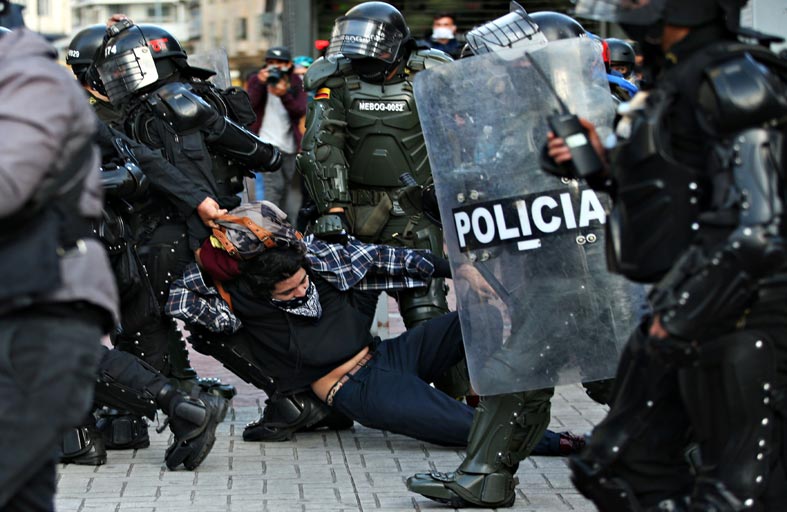 تظاهر آلاف الكولومبيين ضد استخدام الشرطة للقوة وسياسات الحكومة، وذلك بعد 11 يوما على إثارة وفاة رجل على أيدي الشرطة احتجاجات في البلاد. وقادت النقابات والطلبة المسيرات التي هتف المشاركون فيها بشعارات مناهضة لاستخدام الشرطة القوة ما أسفر عن وقوع صدامات مع قوى الأمن وسط بوغوتا، مركز الحركة الاحتجاجية. وألقى المتظاهرون الحجارة على عناصر الشرطة الذين ردوا بإطلاق الغاز المسيل والقنابل الصوتية، بحسب مراسل فرانس برس. وتدخلت شرطة مكافحة الشغب للسيطرة على أعمال “العنف” في بوغوتا كما في مدينة ميديين (شمال غرب) وباستو (جنوب غرب)، بحسب قائد الشرطة أوسكار أتيهورتوا.