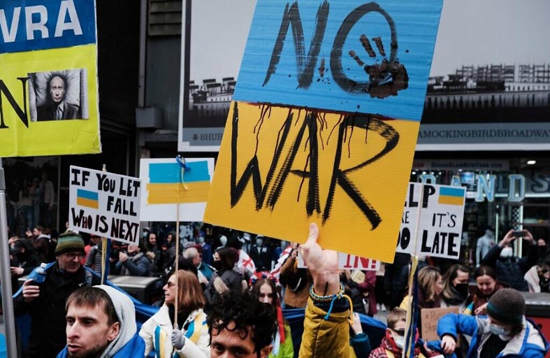 تجمع آلاف من الأوكرانيين والأميركيين من أصل أوكراني ومن جنسيات أخرى أمس الأول السبت في ساحة تايمز الرمزية في نيويورك للمطالبة بتدخل حلف شمال الأطلسي والولايات المتحدة والاتحاد الأوروبي في أوكرانيا.