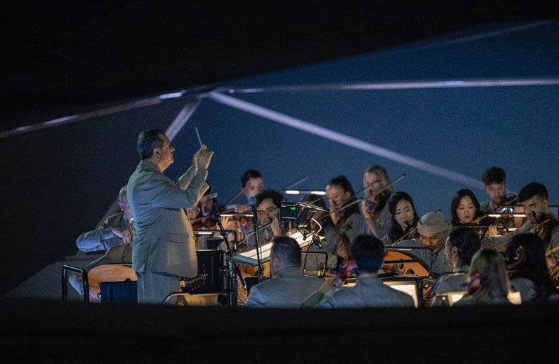 وأدت الأوركسترا الأنغام الموسيقية المصاحبة للسرد القصصي والبصري الذي تناول أبرز محطات تاريخ الدولة ونهضتها. وبرزت اللحظة الأكثر تأثيراً مع الأداء الأول للسلام الوطني "عيشي بلادي"، الذي ترك أثراً عميقاً من الفخر والوحدة في وجدان الجمهور.