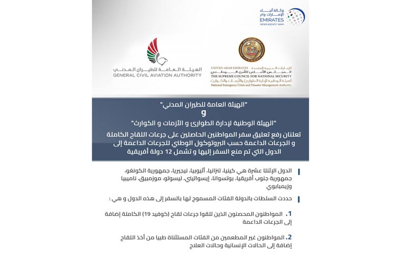 أعلنت الهيئة العامة للطيران المدني و الهيئة الوطنية لإدارة الطوارئ والأزمات والكوارث رفع تعليق سفر المواطنين الحاصلين على جرعات اللقاح الكاملة و الجرعات الداعمة حسب البروتوكول الوطني للجرعات الداعمة .. إلى الدول التي تم منع السفر إليها وهي كينيا، تنزانيا، أثيوبيا، نيجيريا، جمهورية الكونغو، جمهورية جنوب أفريقيا، بوتسوانا، إيسواتيني، ليسوتو، موزمبيق، ناميبيا وزيمبابوي، وذلك اعتبارا من يوم الأحد الموافق 6 فبراير الجاري.