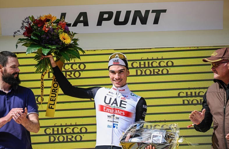 حقق خوان أيوسو دراج فريق الإمارات فوزاً مهماً في المرحلة الخامسة من سباق طواف سويسرا من "فيش" إلى "لا بونت" بطول 211 كلم. ووصل أيوسو "20 " عاماً إلى خط النهاية في المركز الأول محتفلاً بفوزه الثاني في هذا الموسم، قاطعاً المسافة في 5:23.01 دقيقة، بينما احتل ماتيوس سكجيلموس من فريق تريك سيجافرويدو المركز الثاني، وحل بيلو بلباو من فريق البحرين فيكتوريوس في المركز الثالث. وعبر أيوسو عن سعادته بهذا الفوز، ورغبته في متابعة التحدي من أجل تصدر التصنيف العام، وقال إنه سيسعى لتحقيق هذا الهدف، على الرغم من المنافسة القوية التي ستمتد على طول الطريق حتى يوم غد الأحد.