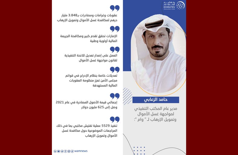 وقال سعادة حامد الزعابي مدير عام المكتب التنفيذي لمواجهة غسل الأموال وتمويل الإرهاب في حوار مع وكالة أنباء الإمارات "وام": تدلل تلك البيانات على تقدم كبير في تعزيز نهج الإمارات في مكافحة غسل الأموال وتمويل الإرهاب بما يتماشى مع المعايير العالمية والتزامها بمكافحة الجريمة المالية كأولوية وطنية.