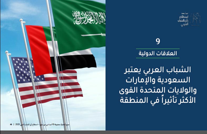 وبشأن آرائهم حول الديناميكيات المتغيرة للعلاقات الدولية، ينظر الشباب العربي إلى السعودية والإمارات باعتبارهما القوتان العربيتان الأكثر تأثيراً على البيئة الجيوسياسية في المنطقة (39% و34% على التوالي). ومن بين الدول غير العربية، يرى الشباب العربي أن الولايات المتحدة زادت نفوذها في المنطقة خلال السنوات الخمس الماضية. وتبدو نظرة الشباب العربي إلى الولايات المتحدة هذا العام أكثر إيجابيةً (56%) مقارنةً بعام 2019 (41%) أو بأي وقت آخر منذ عام 2016.