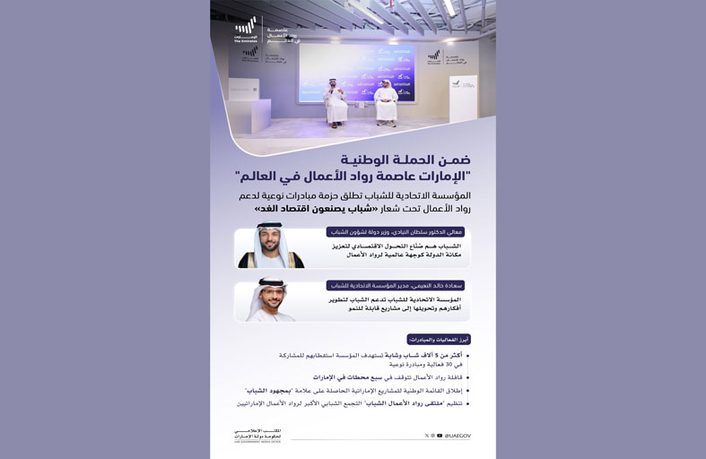 وأضاف معاليه أن حملة “الإمارات عاصمة رواد الأعمال في العالم” تمثل خطوة إستراتيجية كمنصة عالمية لريادة الأعمال وبيئة حاضنة للمواهب، إذ تُعد نموذجاً وطنياً تفاعلياً للتعاون البنّاء بين المؤسسات في القطاعين الحكومي والخاص، بما يحقق تكامل الجهود ويوحد الطاقات نحو هدف مشترك يتمثل في تفعيل دور الشباب كركيزة أساسية لريادة قطاعات الاقتصاد الجديد، وبما يتماشى مع توجهات مسيرة التنمية الوطنية، وتحقيق تطلعات الدولة في مجال ريادة الأعمال والابتكار الاقتصادي المستدام.من جانبه قال سعادة خالد النعيمي إن مشاركة المؤسسة الاتحادية للشباب، في حملة “الإمارات عاصمة رواد الأعمال في العالم” تأتي كجزء من التزاماتها بدعم الشباب في مختلف مراحل رحلتهم الريادية، إذ تضطلع بدور محوري من خلال تصميم وتنفيذ برامج وفعاليات تركز على بناء قدرات الشباب، وتعزيز جاهزيتهم للانخراط في المنظومة الاقتصادية بكفاءة مثالية، وتُمكّنهم من تنمية مهاراتهم، وتساعدهم على مواجهة التحديات العملية بثقة ضمن بيئة اقتصادية ديناميكية ومستدامة.وأضاف أن جهود المؤسسة تركز على توفير مسارات تدريبية تدعم الشباب على تطوير أفكارهم وتحويلها إلى مشاريع قابلة للنمو، وبناء شبكة من العلاقات التي تدعم تطلعاتهم، لذلك نعمل بشكل مباشر مع الشباب لتزويدهم بالأدوات التي تمكّنهم من دخول السوق، وفهم آليات العمل، واتخاذ قرارات مبنية على معرفة وتجربة واقعية، فضلاً عن ترسيخ ثقافة الابتكار كمحرك رئيسي لبناء مشاريع قادرة على خلق أثر اقتصادي واجتماعي ملموس.