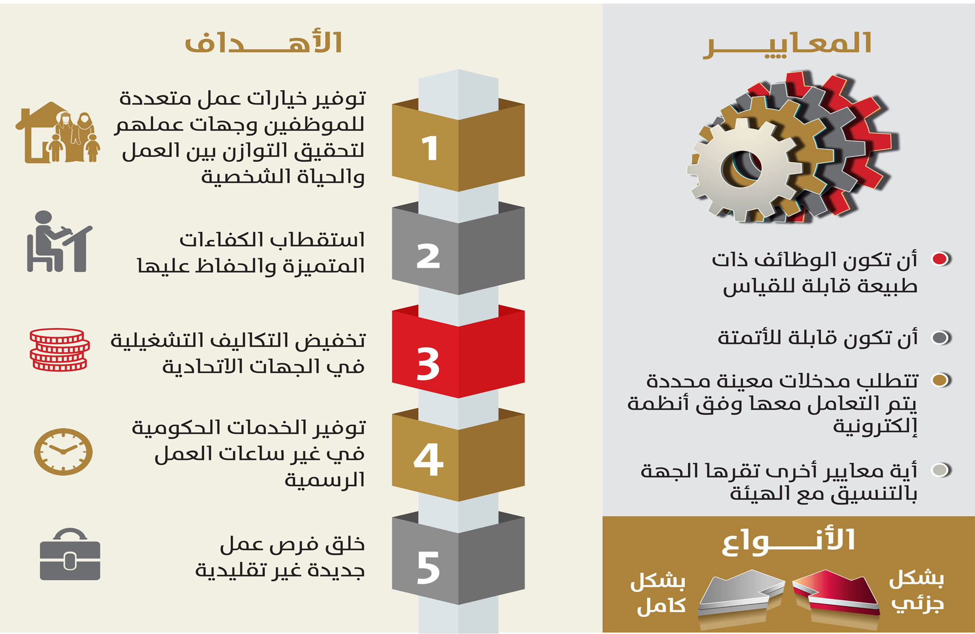 وأشارت الهيئة إلى أن ثمة مجموعة من المعايير على الوزارات والجهات الاتحادية الالتزام بها عند تحديد الوظائف الملائمة للعمل عن بعد ومنها: (أن تكون الوظائف ذات طبيعة قابلة للتجزئة، وأن تكون قابلة للأتمتة، وأن تتطلب مدخلات محددة يتم التعامل معها وفق أنظمة إلكترونية).