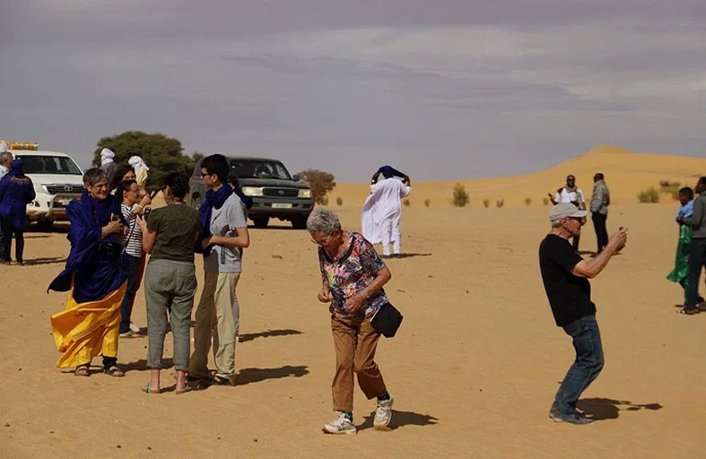تقدّم أطباق اللحم المشوي فيما تتردّد أصداء آلات الغيتار الكهربائيّة بين الكثبان الرمليّة الزهريّة، ثاني أعلى كثبان في منطقة الصحراء كما يؤكد السكان المحليون. يقول الموسيقيّ عمارة مختار المعروف باسم بامبينو “وكأنّنا نعزف في ديارنا”، موضحا أن الصحراء هي”المكان الذي ولدنا فيه، والذي كبرنا فيه، تذكّرنا بجذورنا».