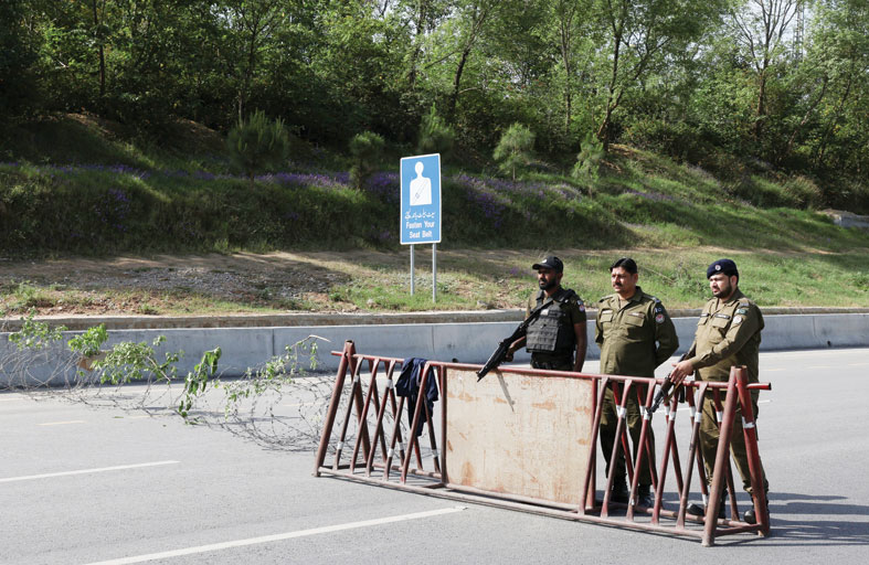 وذكرت صحيفة إكسبريس تريبيون الباكستانية، أمس الأحد، أنه تم نشر أكثر من 10 آلاف عنصر من الشرطة، وأُقيم أكثر من 600 نقطة تفتيش في جميع أنحاء المدينة، وأعلنت السلطات أنه اعتباراً من منتصف ليل الأحد، سيتم إغلاق عدة مناطق حساسة محيطة بقاعدة نور خان الجوية ومطار إسلام آباد الدولي.
