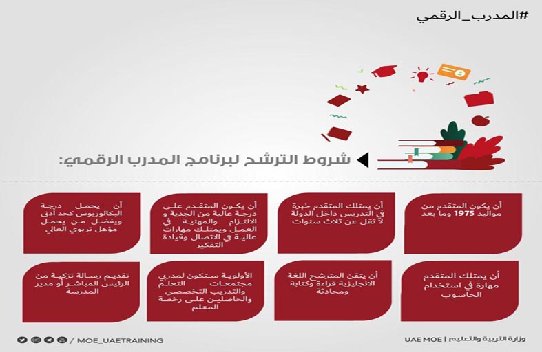 واعتمدت الوزارة 8 إشتراطات للالتحاق بالبرنامج، أهمها أن يكون المتقدم من مواليد 1975 وما بعدها، ويمتلك خبرة في التدريس داخل الدولة لا تقل عن 3 سنوات، وعلى درجة عالية من الجدية والالتزام والمهنية، ويمتلك مهارات في الاتصال وقيادة التفكير، ويكون حامل لدرجة البكارلوريوس ويفضل الحاصلين على مؤهل تربوي عالي، ولديه مهارات استخدام الحاسوب، ويتقن اللغتين العربية والانجليزية، وتقديم رسالة تزكية من الرئيس المباشر أو مدير المدرسة، على أن تكون الاولوية لمدربي مجتمعات التعلم والتدريب التخصصي والحاصلين على رخصة المعلم.